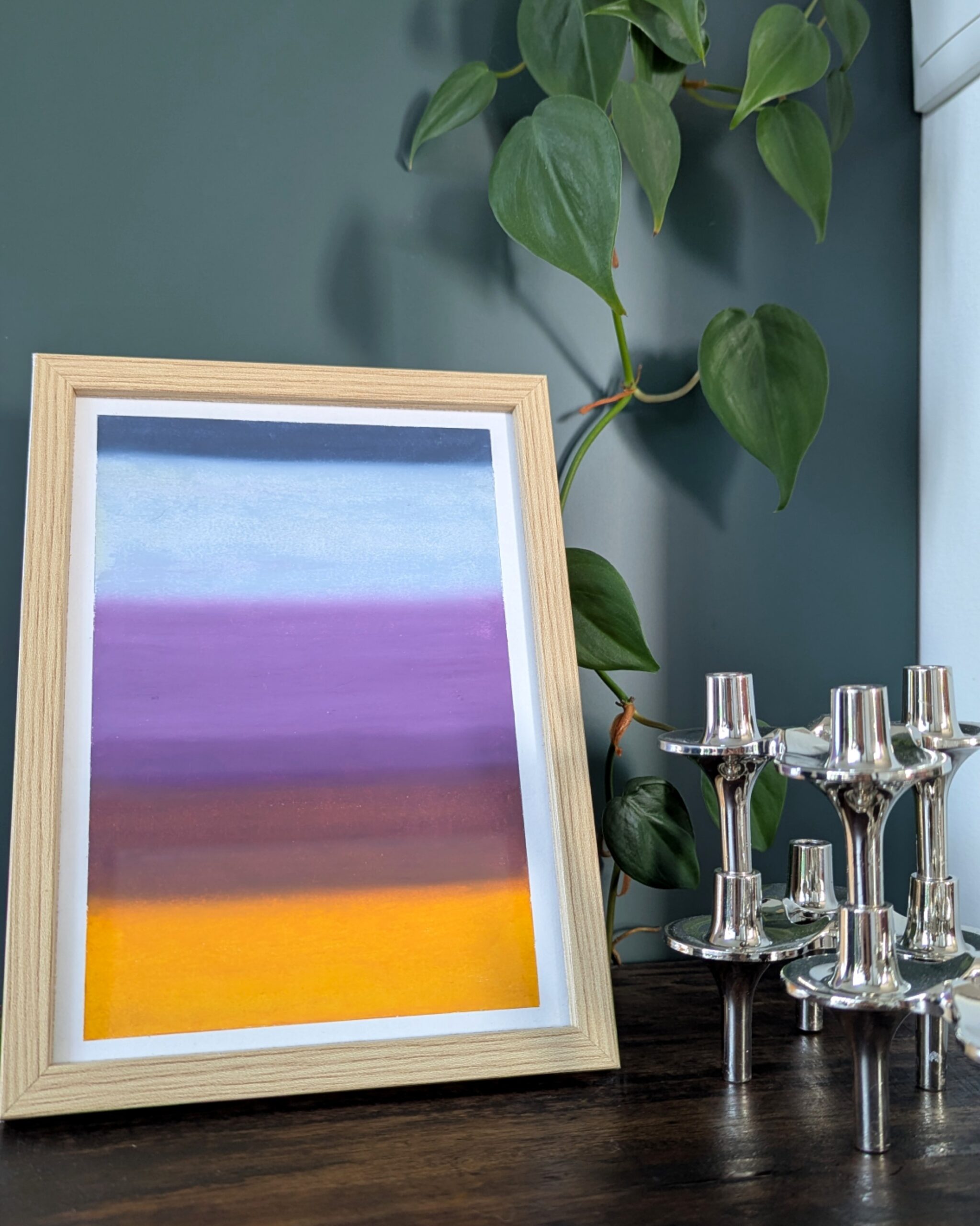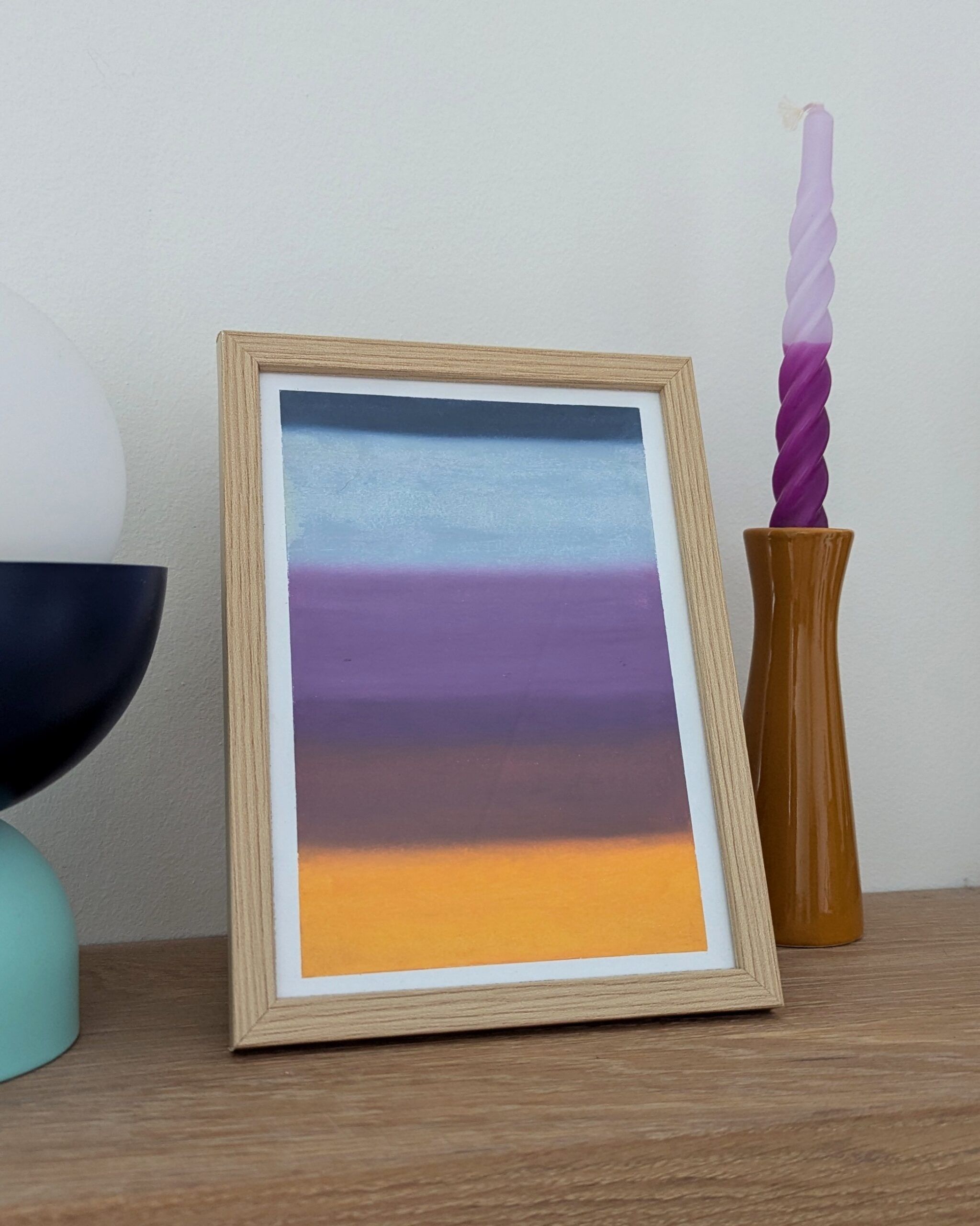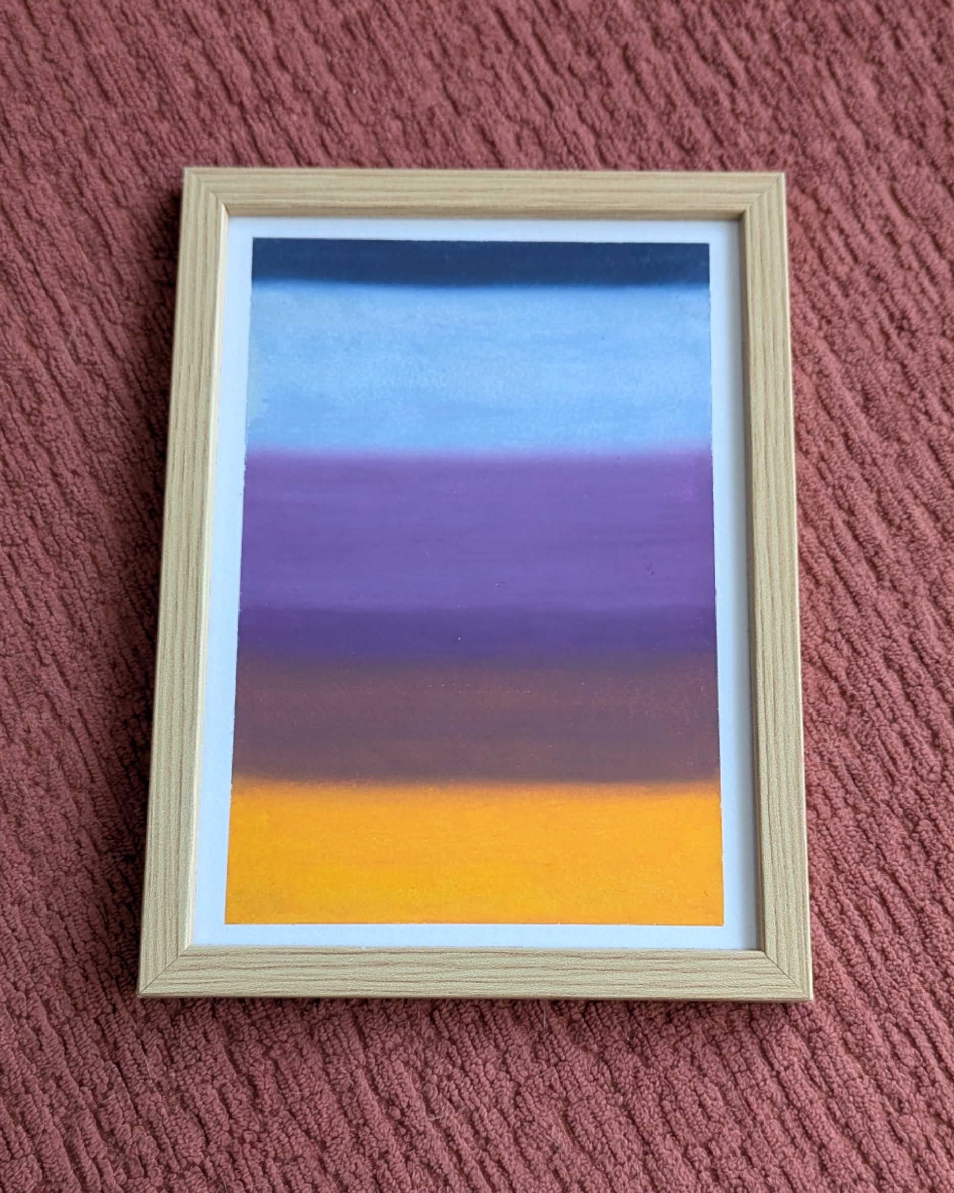 Avoid touching the surface and preferably do not remove from the frame, since oil pastels never fully dry and fingerprints may be left visible or smudging/scratching might occur.