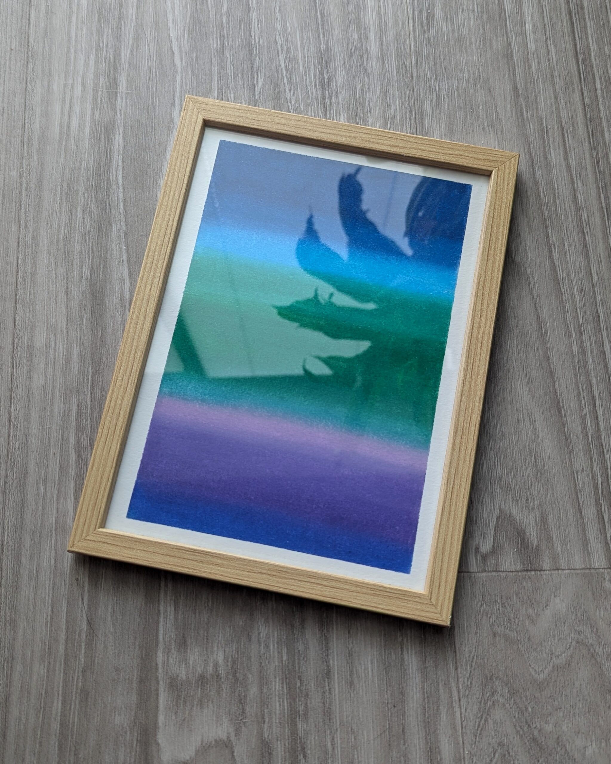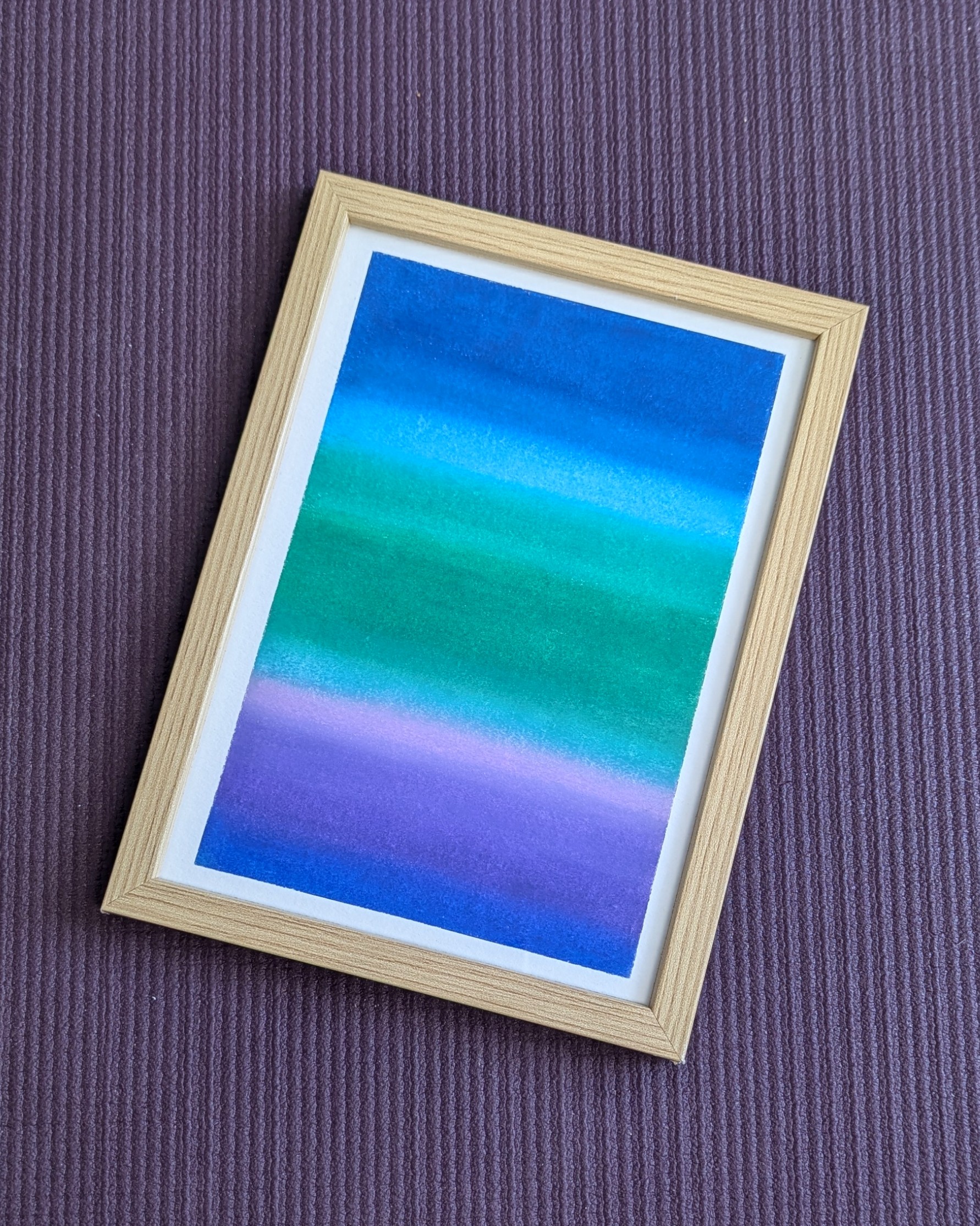 Avoid touching the surface and preferably do not remove from the frame, since oil pastels never fully dry and fingerprints may be left visible or smudging/scratching might occur.