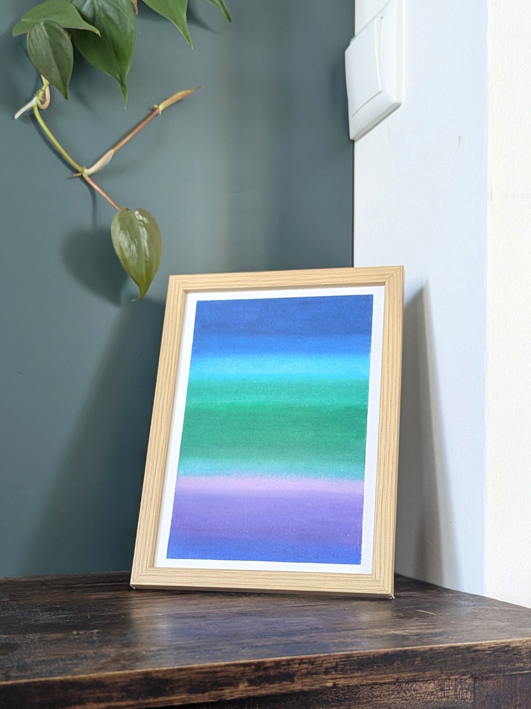 Traverse the cosmos and drift among the stars with this oil pastel painting, reflecting the mysterious colours of the galaxy.